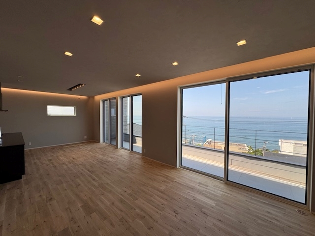 リビングからも相模湾が・・・ワイドサッシ、無垢床、室内珪藻土壁、